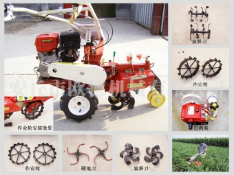 1、標配 2、扶壟器 3、播種施肥簍 4、除草輪 5、打藥泵 6、旋耕機